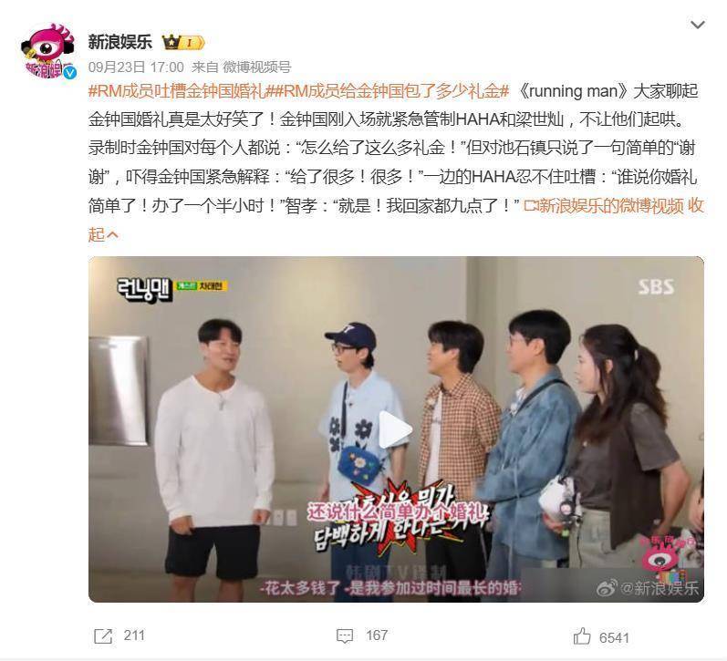 关于婚典为何从揣测的30分钟延伸到1.5小时,集聚文静传的一种说法似乎给出了谜底:据传“国民MC”刘在石送的礼金数额最高。金钟国在节目中也半开打趣地簸弄“收了钱必须好好迎接”,这大约蜿蜒解释了历程不测延伸果真凿原因——礼金太厚,工作得跟上!